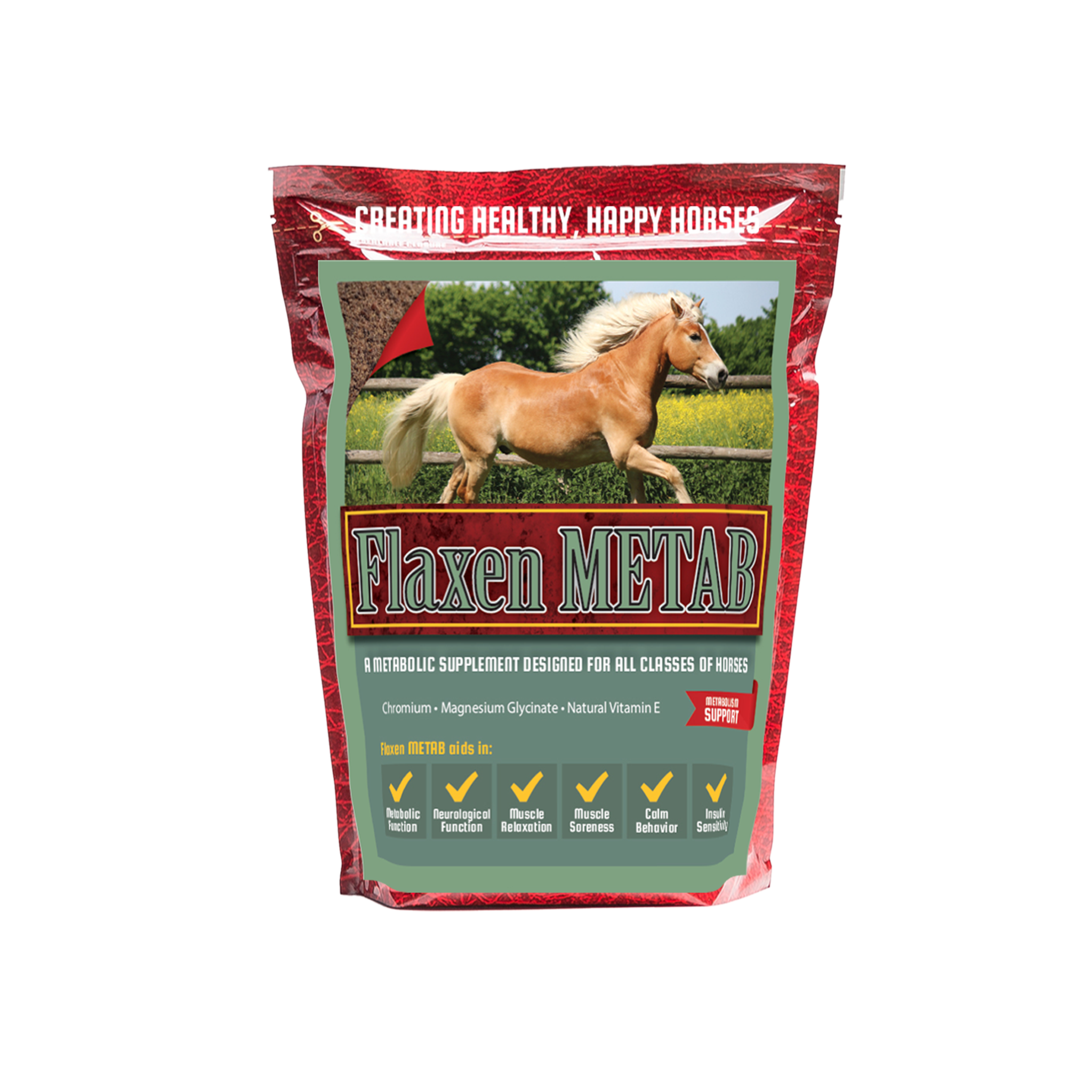Metab is a premium equine supplement designed to support metabolic health, muscle function, and overall performance. Each scoop delivers 2 mg of Chromium to enhance insulin sensitivity, maintain healthy blood glucose levels, improve glucose utilization, and help reduce cortisol (stress hormone); 2,500 mg of highly bioavailable Magnesium Glycinate to promote calm behavior, support muscle relaxation, ease soreness, and be gentle on the digestive system; and 1,000 IU of natural Vitamin E, a powerful antioxidant that supports neuromuscular function and provides essential nutrition for horses without access to fresh pasture. This advanced formula helps horses maintain balance, recover faster, and stay calm, healthy, and ready to perform.
